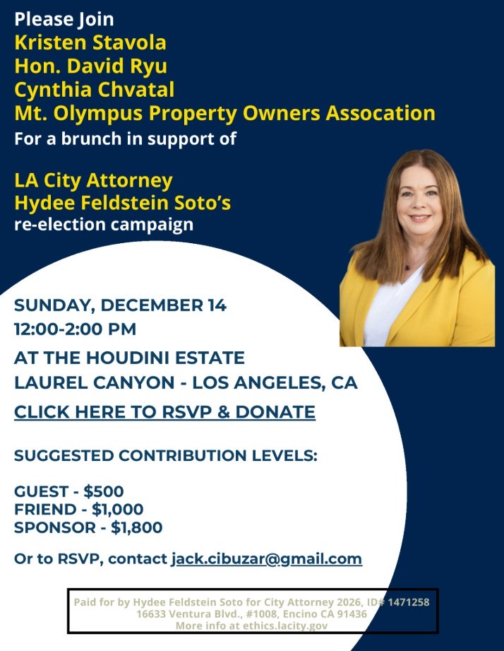 Mt Olympus Property Owners Association is excited to invite you to a fundraiser supporting L.A. City Attorney Hydee Feldstein Soto’s re-election campaign at the Houdini Estate on 12/14 from 12pm to 2pm.